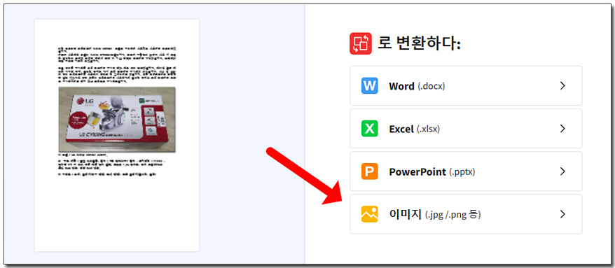 PDF파일이 업로드 되면 우측에 변환할 파일 목록이 나타납니다. Word, Excel, PPT, 이미지 등이 있습니다. 이미지를 선택하여 이미지 파일로 변환해 보겠습니다.