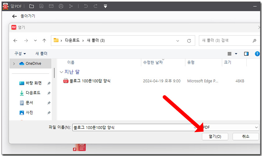 변환할 PDF파일을 선택하는 열기 창이 나타납니다. PDF파일을 선택하고 열기를 클릭해 주세요.