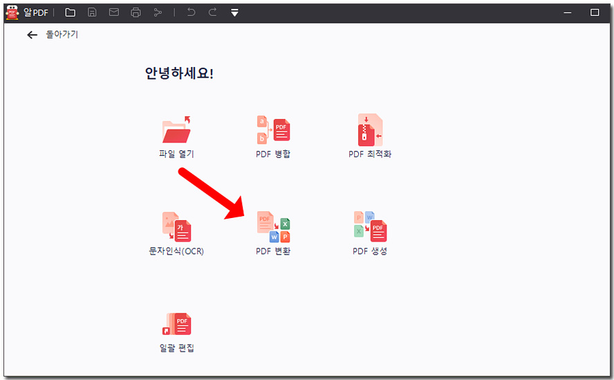알PDF를 실행하면 여러 가지 메뉴가 나타납니다. PDF 변환 아이콘을 클릭해 주세요.