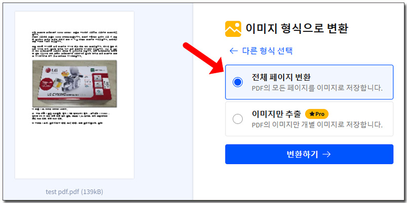 이미지를 선택하면 전체 페이지 변환이 자동으로 설정되어 있습니다. 하단에 변환하기를 클릭하여 주세요.