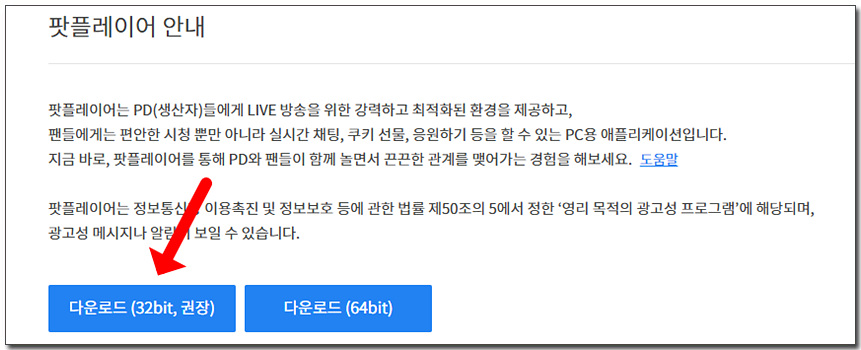 팟플레이어 다운로드 홈페이지에 접속하여 다운로드(32bit) 아이콘을 클릭해 주세요. 64bit보다 더 안정적이고 권장 프로그램입니다.