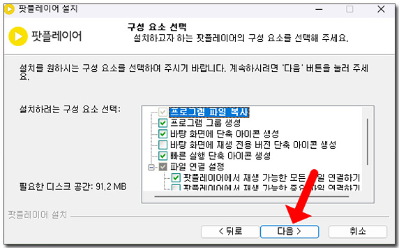 구성요소 선택에서 다음을 클릭하고 설치 위치 선택에서 설치를 클릭해 주세요.